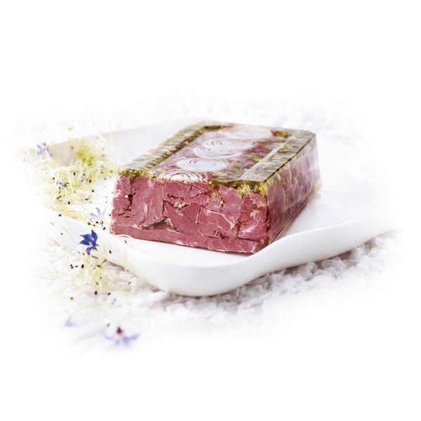 Zartes Schweinebäckchenfleisch, kräftig gepökelt, von Hand in eine Tafelform eingelegt, mit einem pikant-sauren Aspikaufguss, mit vielen frischen Zwiebeln. In Handarbeit garniert mit Zwiebelscheiben und Gurkenwürfeln.