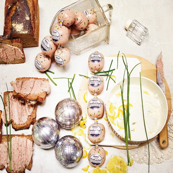 Frisches Truthahnfleisch und Schweineleber, mit reichlich Schnittlauch und Sahne, zu einer kleinen Kugel portionsgerecht im Kunstdarm abgefüllt. Klein und fein im Gewicht, groß im Geschmack.